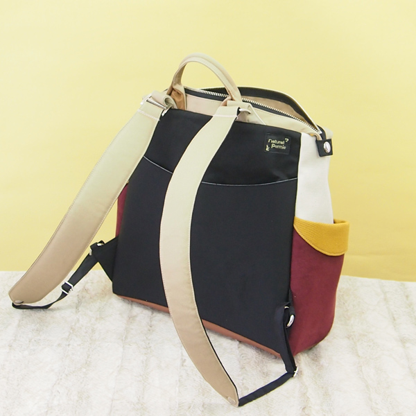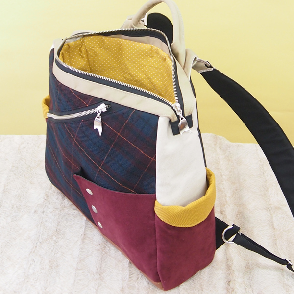 部分的に、スエードやマスタードカラーがおしゃれな英国風リュックです。
