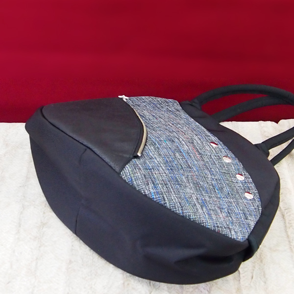 紺白などの糸が織り込まれたキレイめなツイード素材をメインにした上品なバッグです。