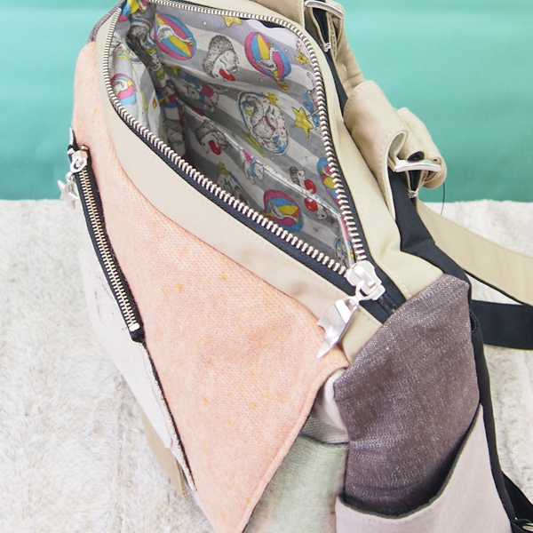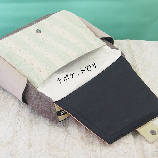 ポケットは、前のファスナーポケットと、フタで閉めるポケット、