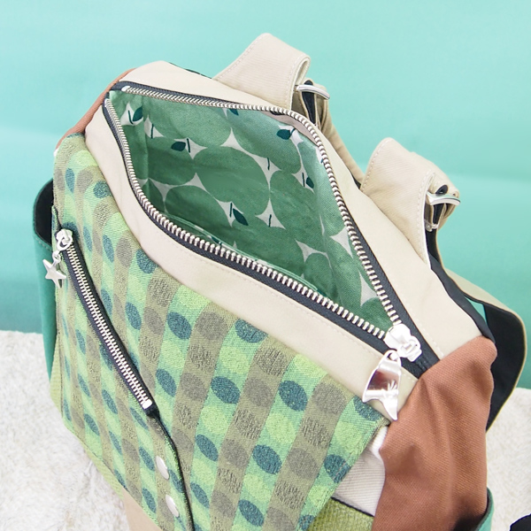 ポケットは、前のファスナーポケットと、フタで閉めるポケット、